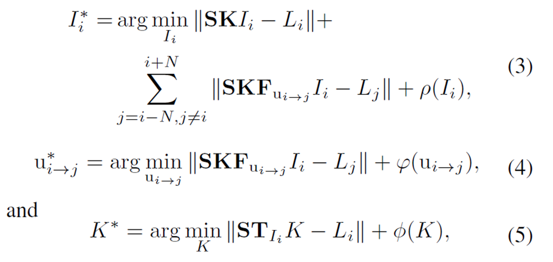 VSR 문제에서 주어진 LR 프레임들로부터 우리가 구하고자 하는 것은 HR 프레임, optical flow, blur kernel 이며 MAP에 기반하여 아래와 같이 표현 할 수 있다.