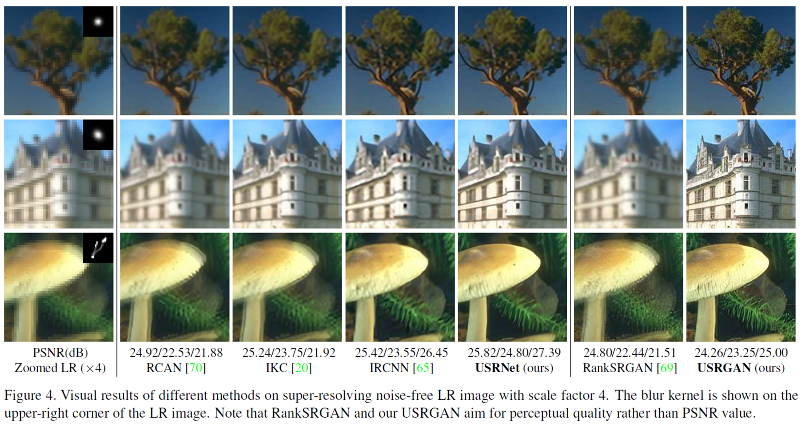 또한, 본 논문에서 추가적으로 실험한 USRGAN 결과가 PSNR은 USRNet보다 떨어지더라도 비주얼적인 결과는 가장 좋다.